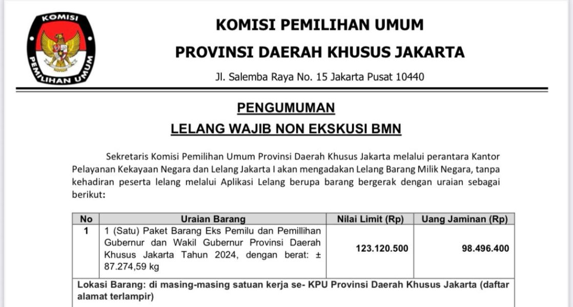 Lelang Non Eksekusi wajib Barang Milik Negara Berupa Barang Habis pakai Eks Pemilu dan Pemilihan Gubernur Wakil Gubernur dan Wakil Gubernur Provinsi Daerah Khusus Jakarta Tahun 2024