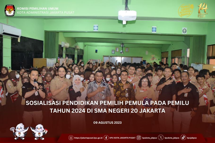 KPU Kota Jakarta Pusat melaksanakan sosialisai pendidikan pemilih di SMA Negeri 20 Jakarta Pusat, Kecamatan Sawah Besar Kota Jakarta Pusat, Rabu (09/08/2023). Sosialisasi ini diikuti oleh siswa-siswi kelas 10 dan 11 SMA Negeri 20 Jakarta yang berjumlah 360 orang, serta didampingi oleh Kepala Sekolah beserta jajarannya.