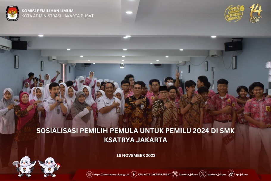 KPU Kota Jakarta Pusat kembali melaksanakan sosialisasi pendidikan pemilih kepada pemilih pemula, kali ini tim sosialisasi pendidikan pemilih KPU Kota Jakarta Pusat berkunjung ke SMK Ksatrya, yang beralamat di Kelurahan Cempaka Putih Barat, Kamis (16/11/2023).