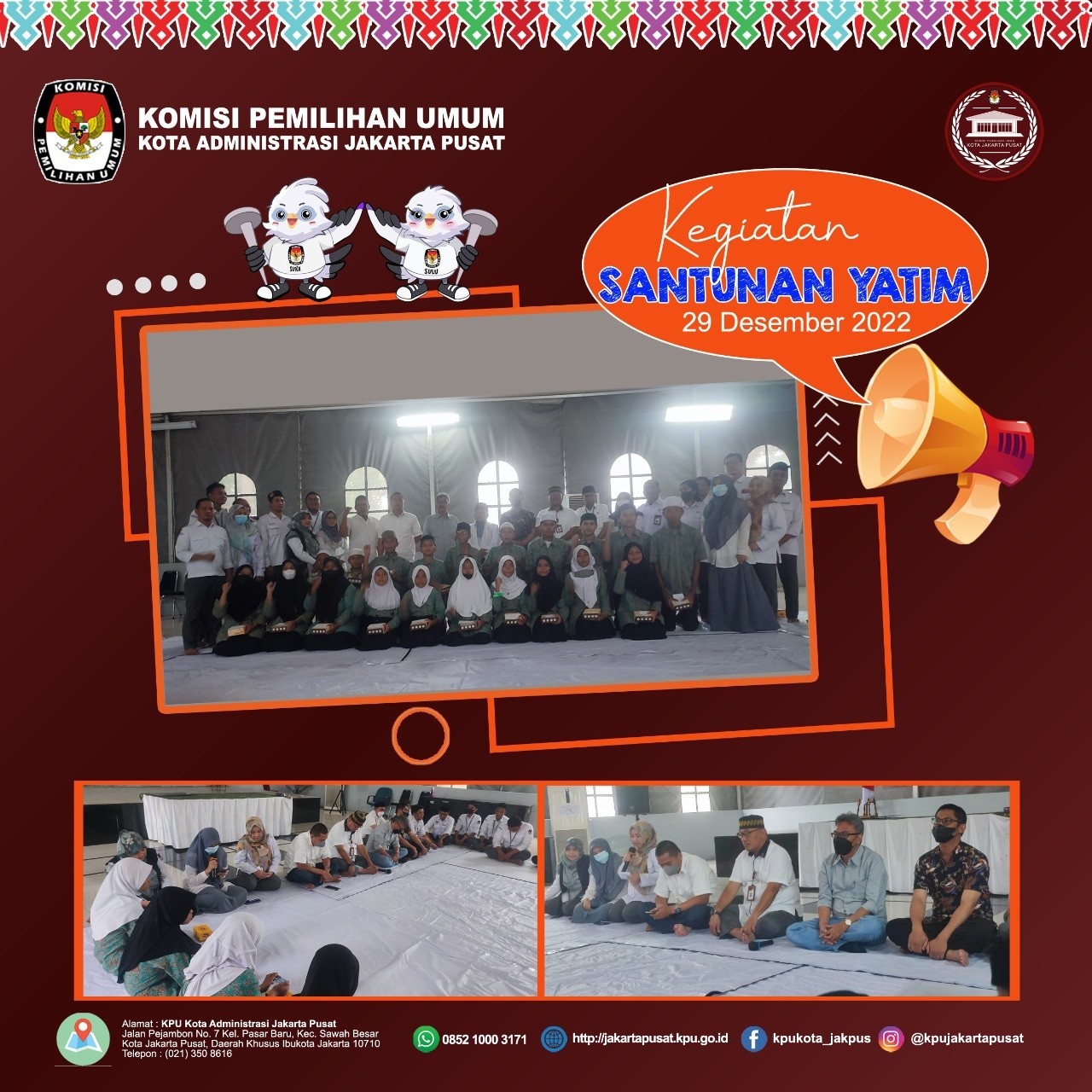 KPU Kota Jakarta Pusat mengadakan kegiatan Santunan anak yatim sebagai bentuk kepedulian dan bentuk rasa syukur atas segala berkat Tuhan YME di tahun 2022, Kamis (29 Desember 2022).
