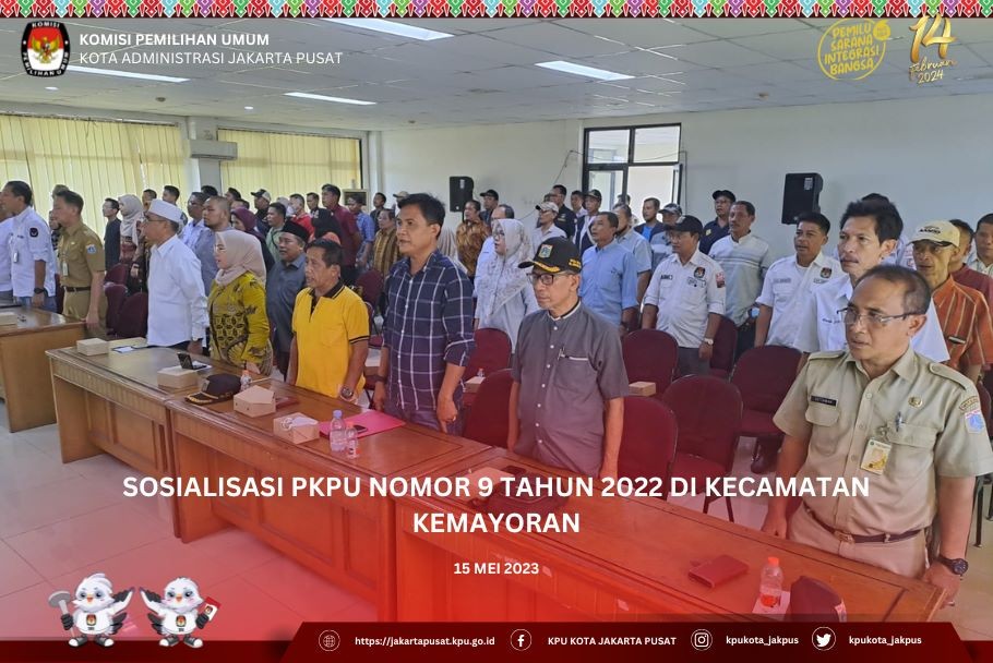 #Temanpemilih, bertempat di Aula Kantor Kecamatan Kemayoran, KPU Kota Jakarta Pusat melaksanakan Sosialisasi Peraturan Komisi Pemilihan Umum Nomor 9 tahun 2022 tentang Partisipasi Masyarakat dalam Pemilihan Umum dan Pemilihan Gubernur dan Wakil Gubernur, Bupati dan Wakil Bupati, dan/atau Walikota dan Wakil Walikota, Senin (15/05/2023).