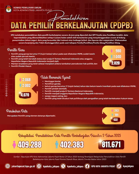 Komisi Pemilihan Umum (KPU) Kota Administrasi Jakarta Pusat menggelar Rapat Pleno Terbuka Rekapitulasi Pemutakhiran Data Pemilih Berkelanjutan (PDPB) Triwulan II Tahun 2025, bertempat di Aula Kantor KPU Kota Administrasi Jakarta Pusat, Rabu (02/07/2025).