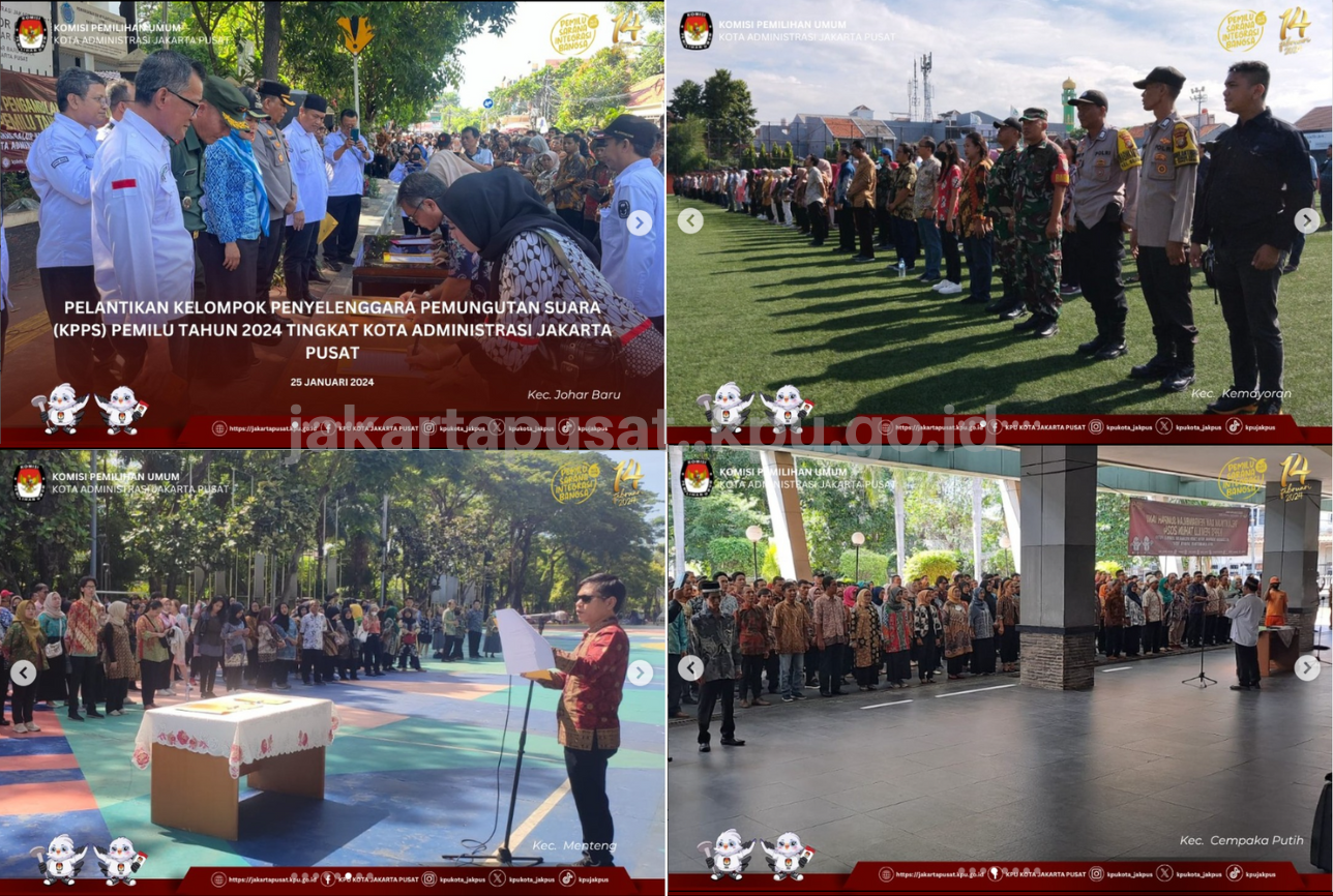 KPU Kota Administrasi Jakarta Pusat mengambil bagian dalam Pelantikan Kelompok Penyelenggara Pemungutan Suara (KPPS) yang digelar secara serentak di seluruh Indonesia pada Kamis, 25 Januari 2024. Adapun jumlah KPPS yang dilantik adalah sebanyak 21.903 orang yang tersebar di 3.129 Tempat Pemungutan Suara (TPS) di 8 Kecamatan se-Kota Administrasi Jakarta Pusat.