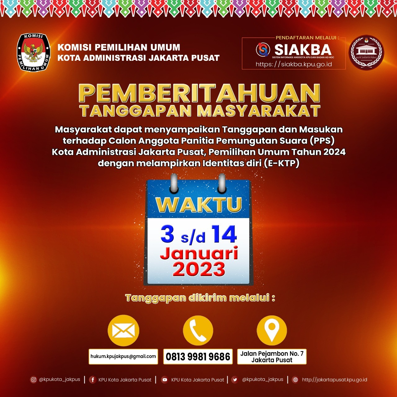 Bagi Teman Pemilih yang memiliki tanggapan dan/atau masukan terkait perekrutan Anggota Panitia Pemungutan Suara (PPS) Kota Jakarta Pusat, Teman Pemilih dapat mengajukan dengan cara melampirkan e-KTP yang dapat disampaikan melalui email, whatsapp atau datang langsung ke kantor KPU Kota Jakarta Pusat.