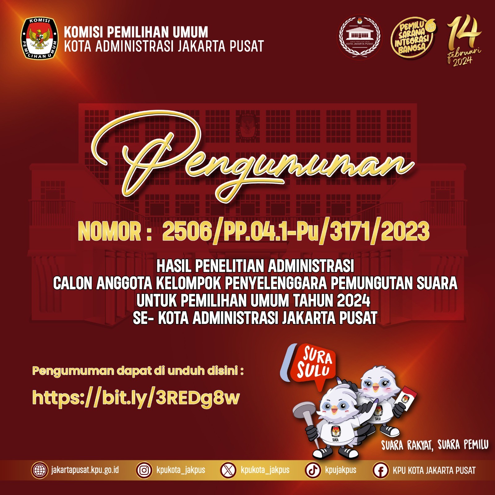 PENGUMUMAN HASIL PENELITIAN ADMINISTRASI CALON ANGGOTA KELOMPOK PENYELENGGARA PEMUNGUTAN SUARA UNTUK PEMILIHAN UMUM TAHUN 2024 SE- KOTA ADMINISTRASI JAKARTA PUSAT