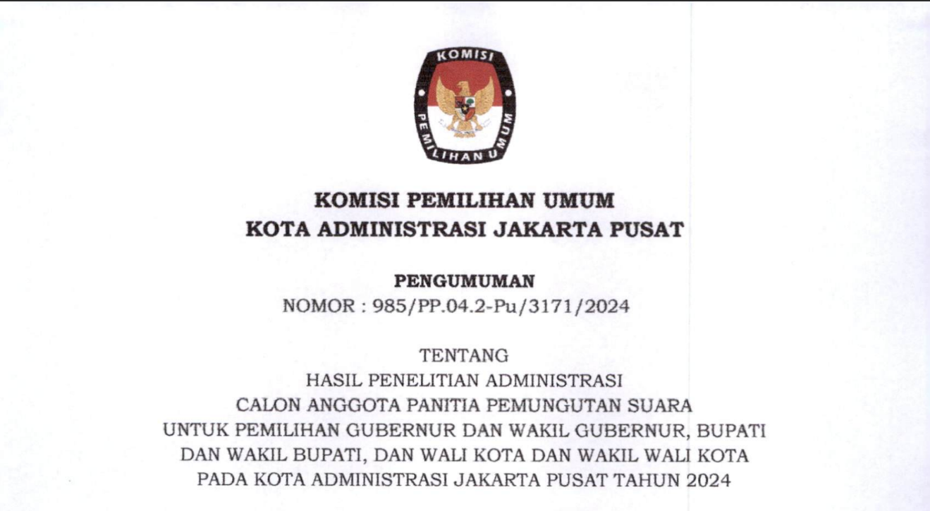 Berikut kami sampaikan pengumuman hasil penelitian administrasi Panitia Pemungutan Suara (PPS) Pemilihan Gubernur dan Wakil Gubernur DKI Jakarta tahun 2024 Kota Administrasi Jakarta Pusat.