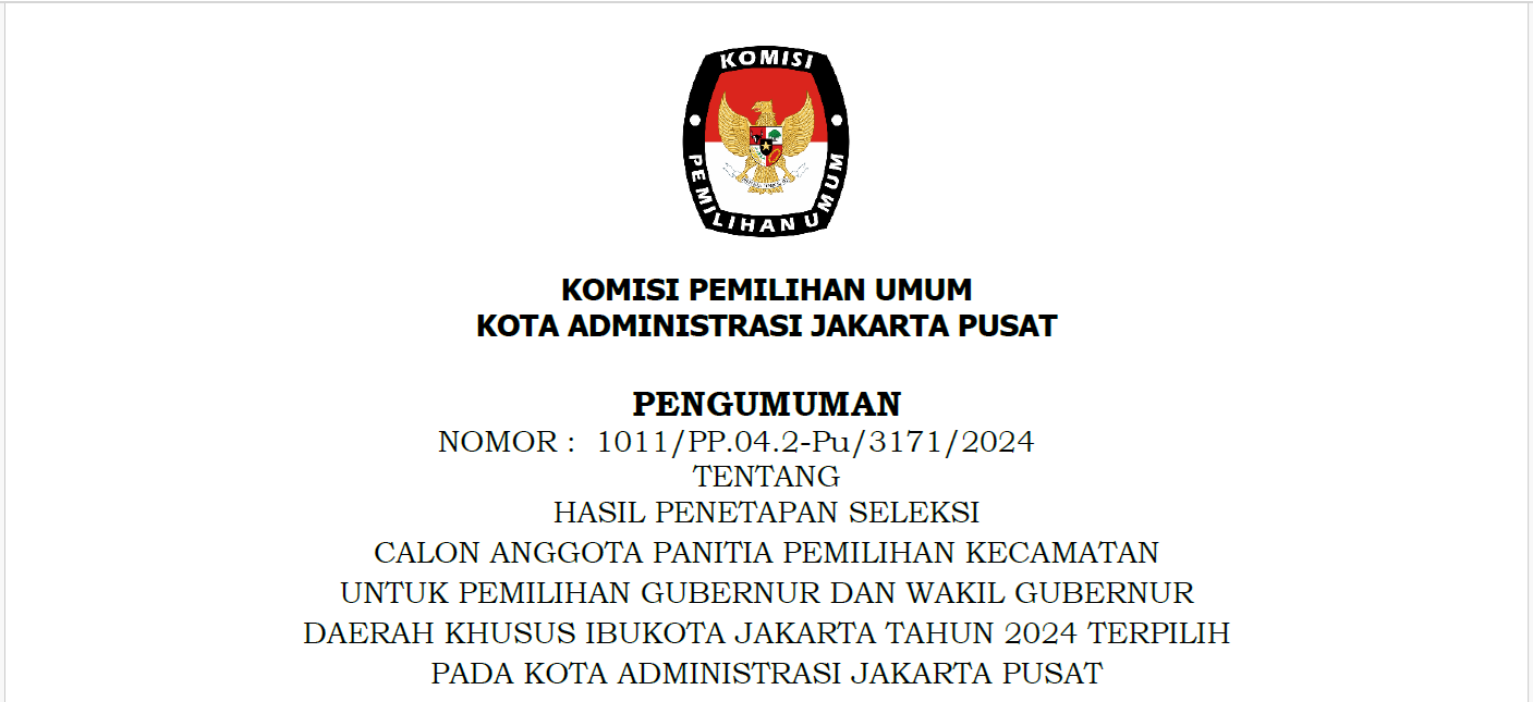 Berikut kami sampaikan hasil penetapan seleksi akhir Panitia Pemilihan Kecamatan (PPK) Pemilihan Gubernur dan Wakil Gubernur DKI Jakarta tahun 2024 Kota Administrasi Jakarta Pusat.