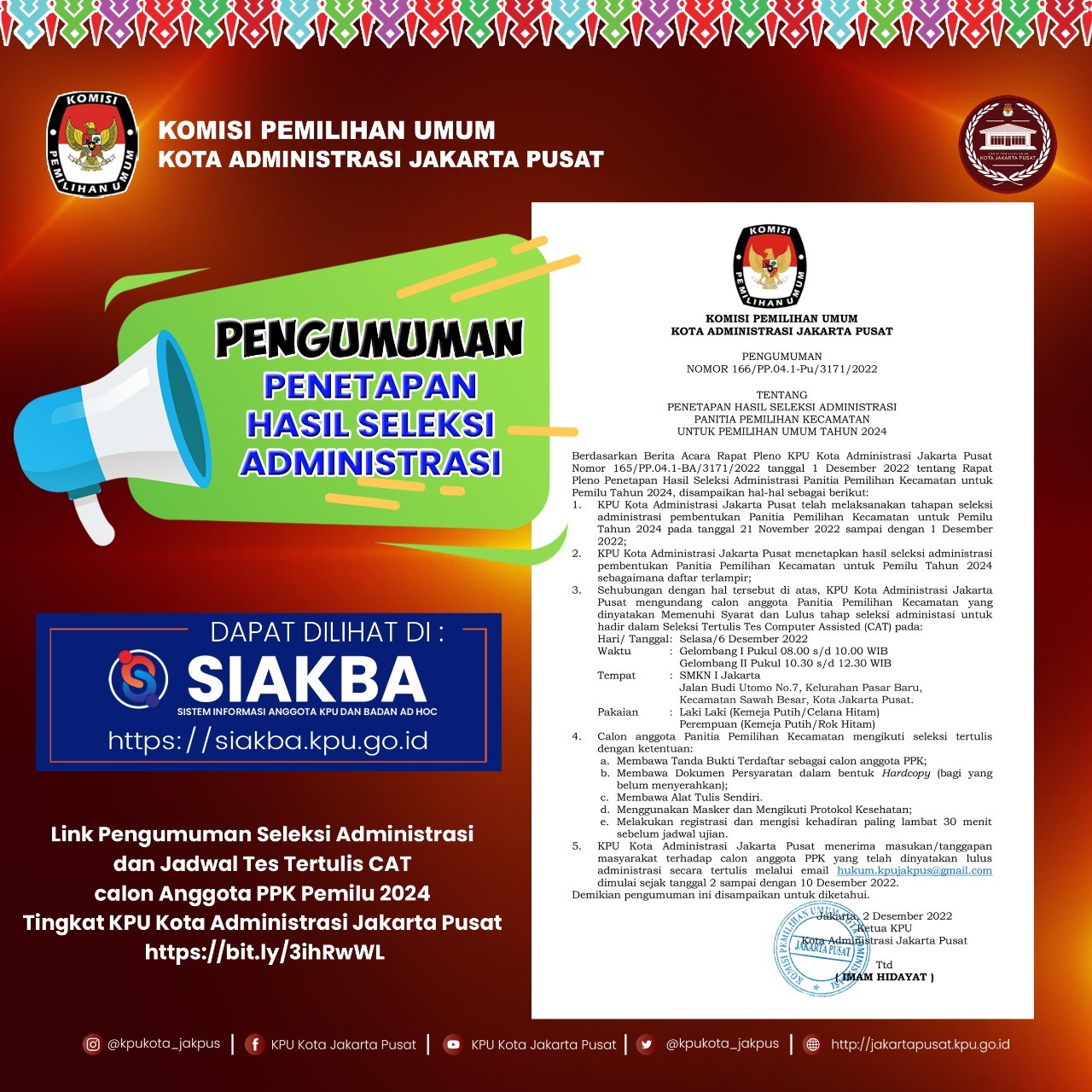 PENGUMUMAN PENETAPAN HASIL SELEKSI ADMINISTRASI PANITIA PEMILIHAN KECAMATAN KPU KOTA ADMINISTASI JAKARTA PUSAT TAHUN 2022