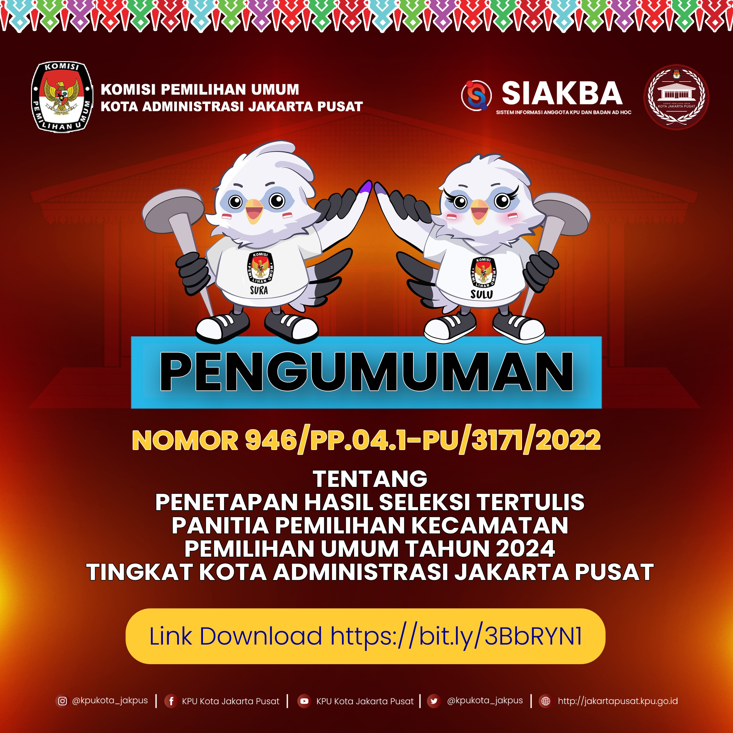 KPU Kota Administrasi Jakarta Pusat menetapkan hasil seleksi tertulis dan Jadwal Seleksi Wawancara pembentukan Panitia Pemilihan Kecamatan pada Pemilihan Umum Tahun 2024 sebagaimana daftar terlampir https://bit.ly/3BbRYN1