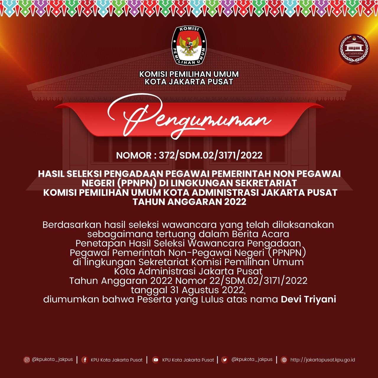 PENGUMUMAN TENTANG HASIL SELEKSI PENGADAAN PEGAWAI PEMERINTAH NON PEGAWAI NEGERI (PPNPN) DI LINGKUNGAN SEKRETARIAT KOMISI PEMILIHAN UMUM KOTA ADMINISTRASI JAKARTA PUSAT TAHUN ANGGARAN 2022