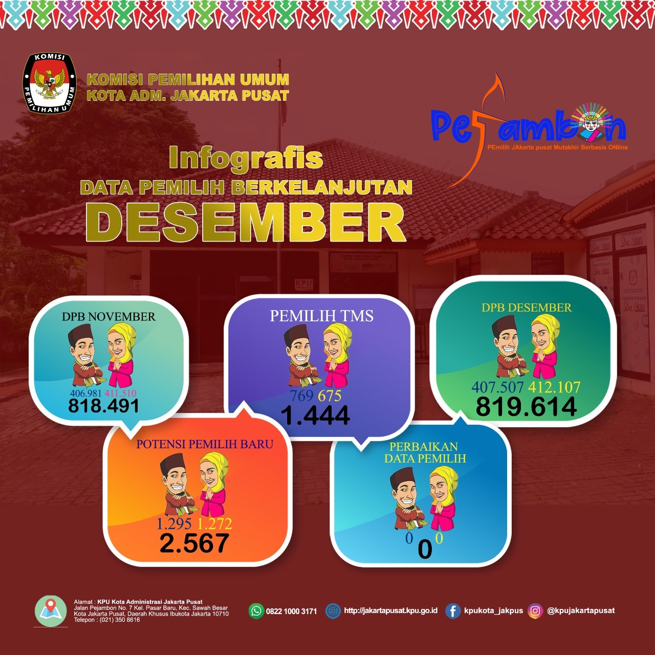 KPU Kota Jakarta Pusat menetapkan hasil Pemutakhiran Data Pemilih Berkelanjutan (DPB) yang dituangkan Dalam Berita Acara KPU Kota Jakarta Pusat Nomor 46/PL.02.1-BA/3171/KPU-KOT/XII/2021 tentang Rapat Koordinasi Daftar Pemilih Berkelanjutan Tahun 2021 Periode Bulan Desember Tahun 2021, hasil Rapat Koordinasi yang dilakukan oleh KPU Kota Administrasi Jakarta Pusat menghasilkan hal sebagai berikut :