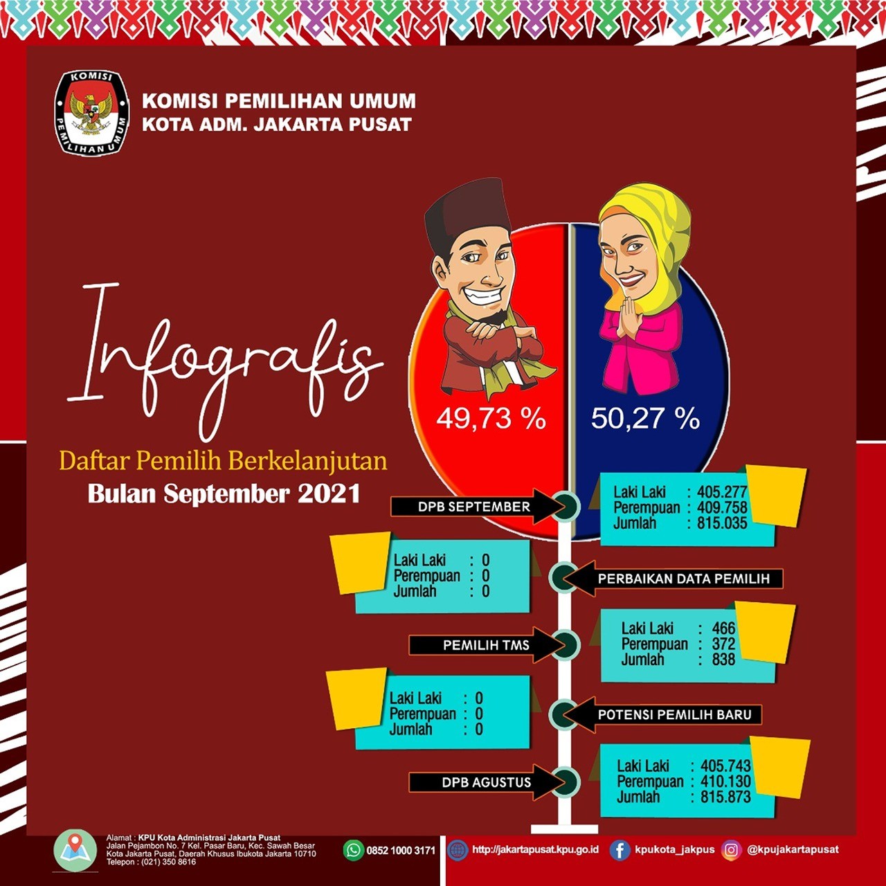 KPU Kota Administrasi Jakarta Pusat menyampaikan hasil rekapitulasi Daftar Pemilih Berkelanjutan Periode Bulan September 2021 Tingkat Kota Administrasi Jakarta Pusat dengan jumlah sebanyak 815.035 (Delapan Ratus Lima Belas Ribu Tiga Puluh Lima) pemilih dengan rincian pemilih laki-laki berjumlah 405.277 (Empat Ratus Lima Ribu Dua Ratus Jujuh Puluh Tujuh) pemilih dan pemilih perempuan berjumlah 409.758 (Empat Ratus Sembilan Ribu Tujuh Ratus Lima Puluh Delapan) pemilih. tersebar di 8 (Delapan) Kecamatan