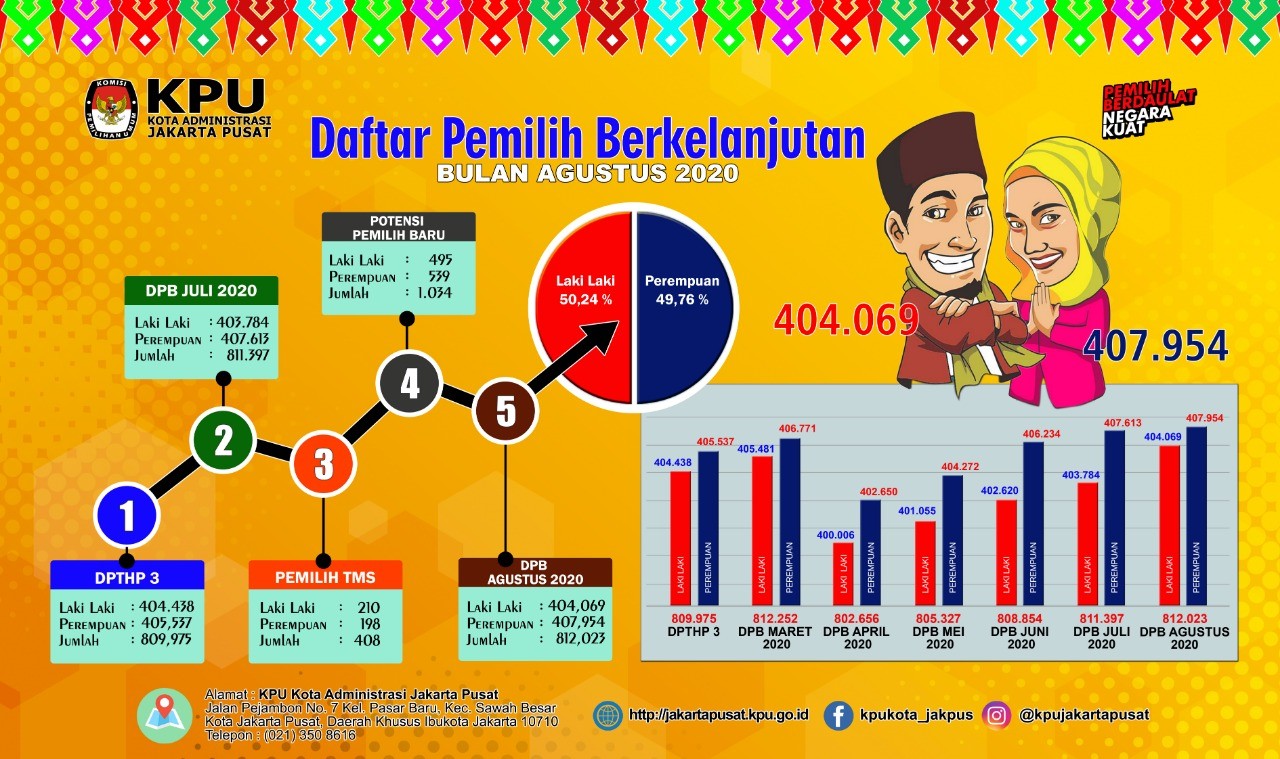KPU Kota Administrasi Jakarta Pusat menyampaikan hasil rekapitulasi Daftar Pemilih Berkelanjutan Periode Bulan Agustus 2020 Tingkat Kota Administrasi Jakarta Pusat dengan jumlah sebanyak 812.023 (Delapan Ratus Dua Belas Ribu Dua Puluh Tiga) pemilih dengan rincian pemilih laki-laki berjumlah 404.069 (Empat Ratus Empat Ribu Enam Puluh Sembilan) pemilih dan pemilih perempuan berjumlah 407.954 (Empat Ratus Tujuh Ribu Sembilan Ratus Lima Puluh Empat) pemilih. tersebar di 8 (Delapan) Kecamatan