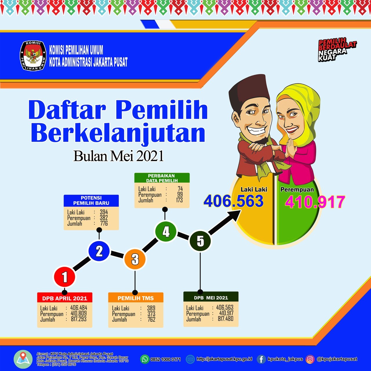 KPU Kota Administrasi Jakarta Pusat menyampaikan hasil rekapitulasi Daftar Pemilih Berkelanjutan Periode Bulan Mei 2021 Tingkat Kota Administrasi Jakarta Pusat dengan jumlah sebanyak 817.480 (Delapan Ratus Tujuh Belas Ribu Empat Ratus Delapan Puluh) pemilih dengan rincian pemilih laki-laki berjumlah 406.563 (Empat Ratus Enam Ribu Lima Ratus Enam Puluh Tiga) pemilih dan pemilih perempuan berjumlah 410.638 (Empat Ratus Sepuluh Ribu Enam Ratus Tiga Puluh Delapan) pemilih. tersebar di 8 (Delapan) Kecamatan