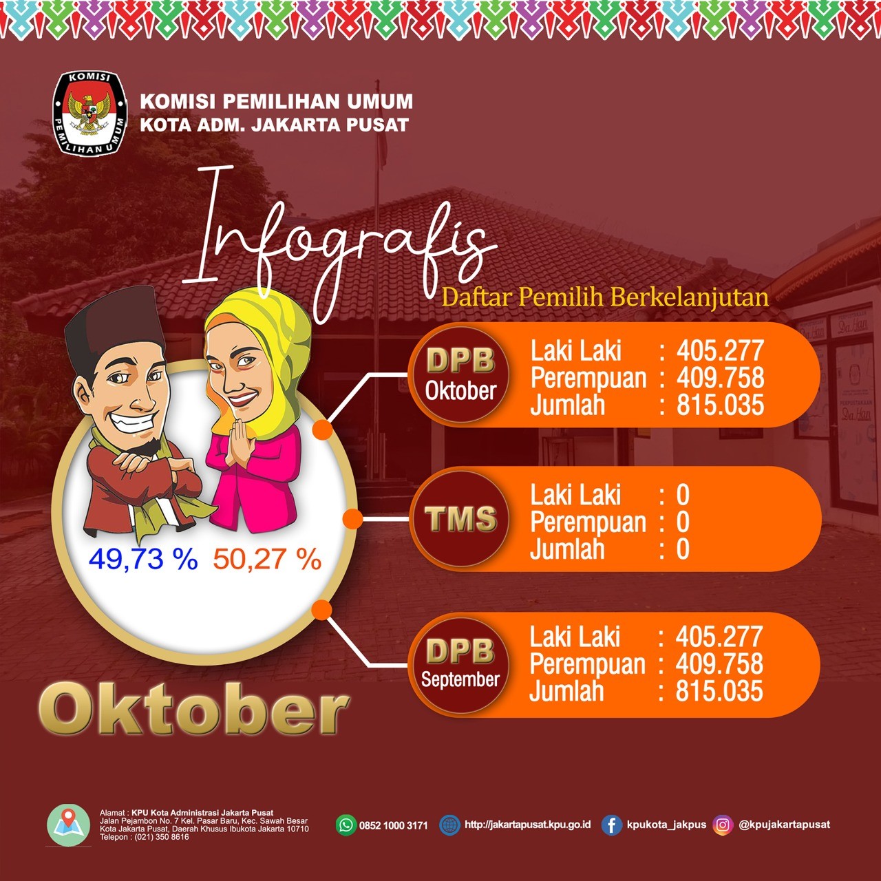 KPU Kota Administrasi Jakarta Pusat menyampaikan hasil rekapitulasi Daftar Pemilih Berkelanjutan Periode Bulan Oktober 2021 Tingkat Kota Administrasi Jakarta Pusat dengan jumlah sebanyak 815.035 (Delapan Ratus Lima Belas Ribu Tiga Puluh Lima) pemilih dengan rincian pemilih laki-laki berjumlah 405.277 (Empat Ratus Lima Ribu Dua Ratus Tujuh Puluh Tujuh) pemilih dan pemilih perempuan berjumlah 409.758 (Empat Ratus Sembilan Ribu Tujuh Ratus Lima Puluh Delapan) pemilih. tersebar di 8 (Delapan) Kecamatan