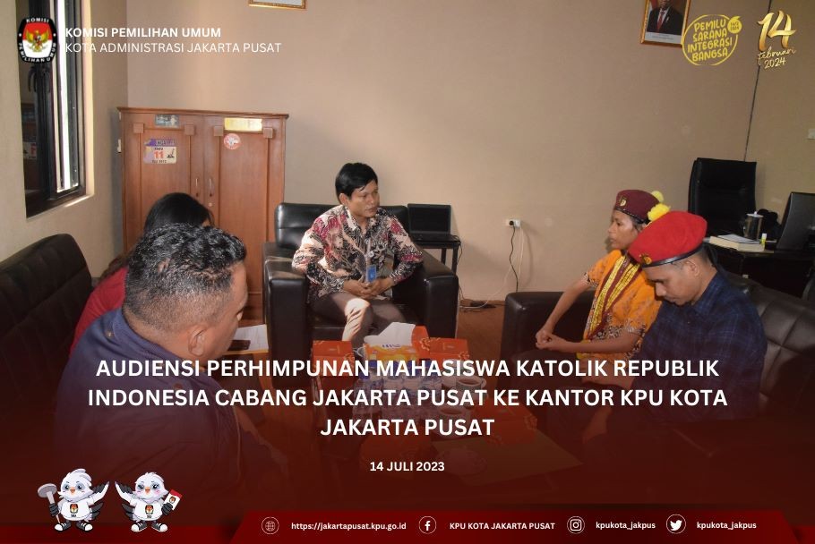Perhimpunan Mahasiswa Katolik Republik Indonesia (PMKRI) Cabang Jakarta Pusat melaksanakan audiensi dengan Ketua dan Anggota KPU Kota Jakarta Pusat dalam rangka mendorong peran aktif mahasiswa pada penyelenggaraan Pemilu dan Pemilihan Serentak tahun 2024, Jumat (14/07/2023).