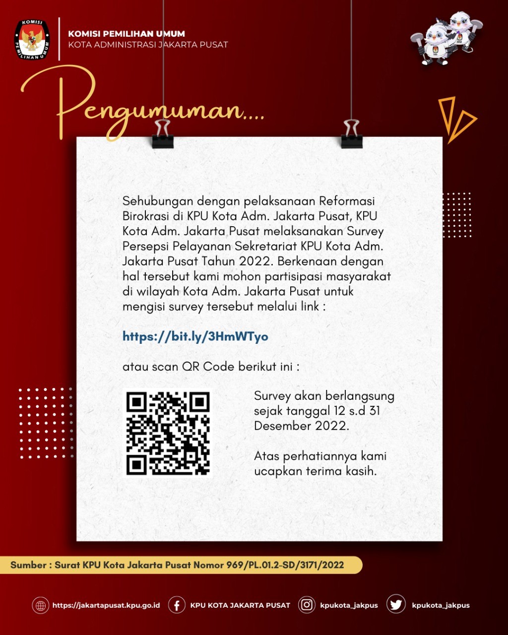 Yuk, bantu KPU Kota Administrasi Jakarta Pusat untuk meningkatkan pelayanan dengan cara mengisi Survey Persepsi Pelayanan Sekretariat KPU Kota Jakarta Pusat Tahun 2022 dengan cara mengisi link survey atau scan QR Code yang tertera pada gambar.